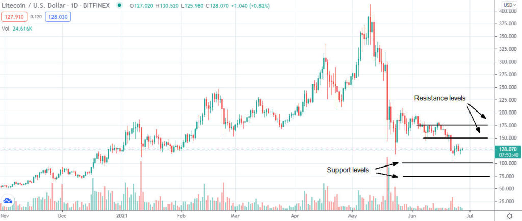 Litecoin has weakened from $413 below $110 since the 10th of May, and the current price stands around $127.