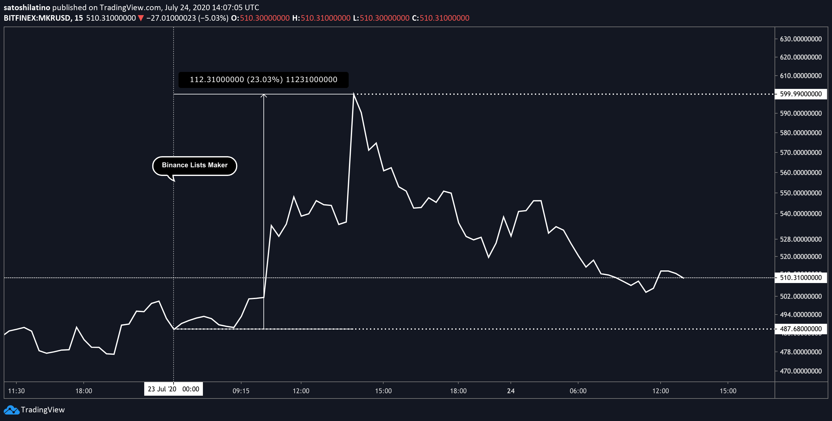 Marker Rises Over 23% to a High of $600. (Source: TradingView)