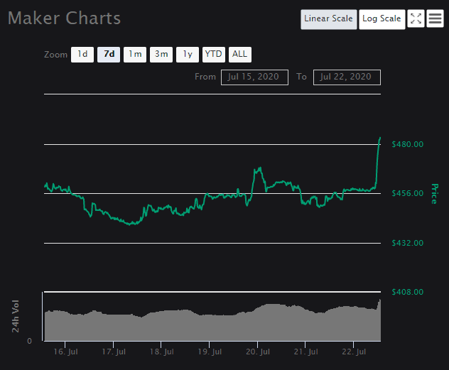 Maker (MKR) price has been struggling with a strong resistance at $500 for an entire month now, ever since it dropped below this level on June 21st. This level has been crucial in the coin’s history, often serving either as a strong support, or a persistent resistance level. However, MKR is now growing again, and is closing in on the troublesome roadblock that is stopping it from venturing further up.