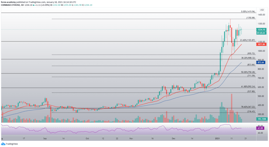 Due to its descending volume (which can be seen on the daily chart) and relatively high RSI value, most analysts predict that Ether’s price will move down and possibly retest the $1,000 level, especially if BTC’s price continues moving towards the downside.