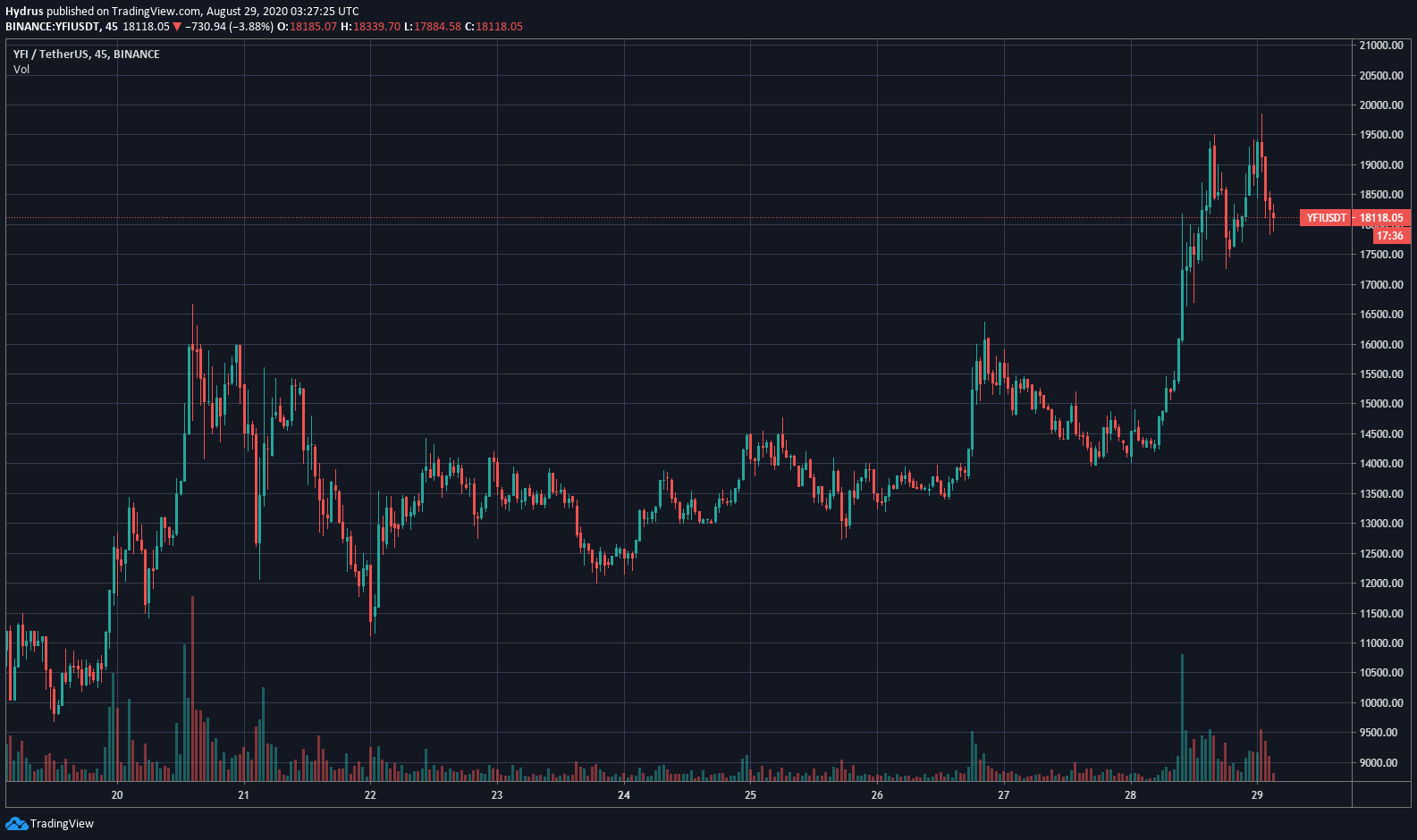 While YFI currently trades at $18,200 as of this article’s writing, it peaked earlier today just shy of $20,000.